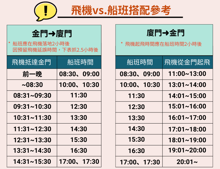 - 金門開船時間:08:30、09:00、10:00、10:30、11:30、12:30、13:30、14:30、15:30、16:30、17:00、17:30