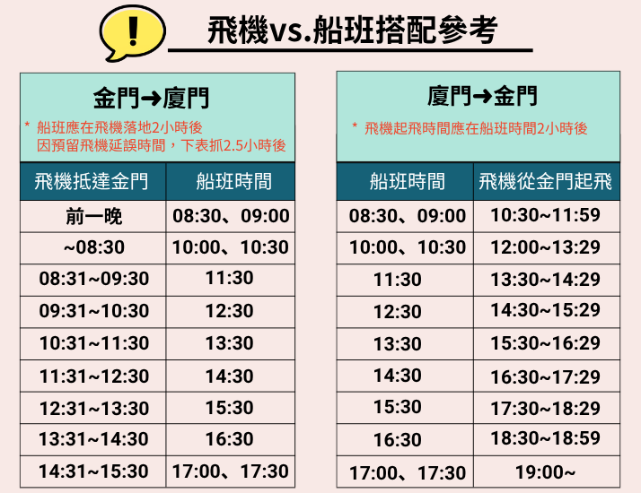- 金門開船時間:08:30、09:00、10:00、10:30、11:30、12:30、13:30、14:30、15:30、16:30、17:00、17:30