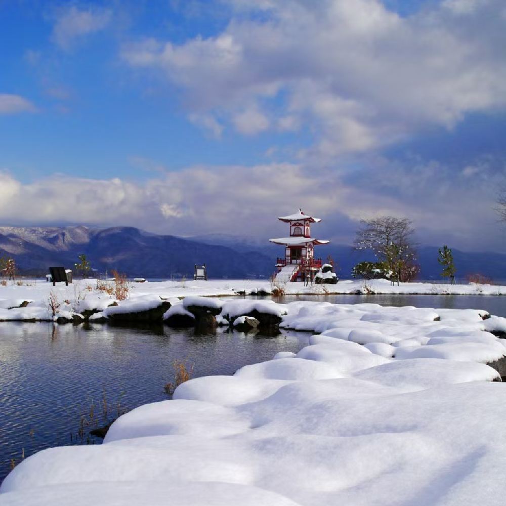 ▲ 冬日的浮見堂公園是洞爺湖畔的冰雪童話。澄澈湖面結起薄冰,岸邊林木裹著銀霜,古樸的浮見堂被白雪層層覆蓋,飛簷翹角在素白天地間格外雅緻。漫步積雪小徑,遠眺羊蹄山的雪頂與澄澈藍天相映,靜謐中透著清冷詩意,隨手一拍都是冬日限定畫卷。