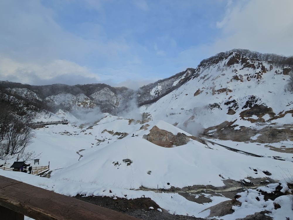 ▲ 冬日的登別地獄谷褪去喧囂,火山噴氣孔升騰的白霧與皚皚白雪交織纏繞。灰褐岩壁覆著厚雪,硫磺熱氣裹挾著凜冽寒風撲面而來,冰火兩重天的奇景震撼人心。踩在積雪的木棧道上,看雪粒在熱氣中融化成水珠,彷彿闖入冰封的秘境,盡顯大自然的磅礴與神秘。