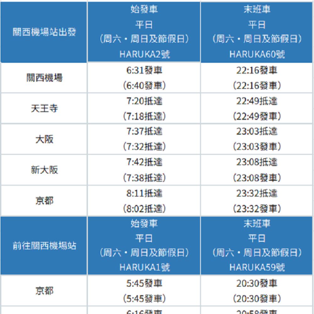 特快HARUKA主要線路時長: