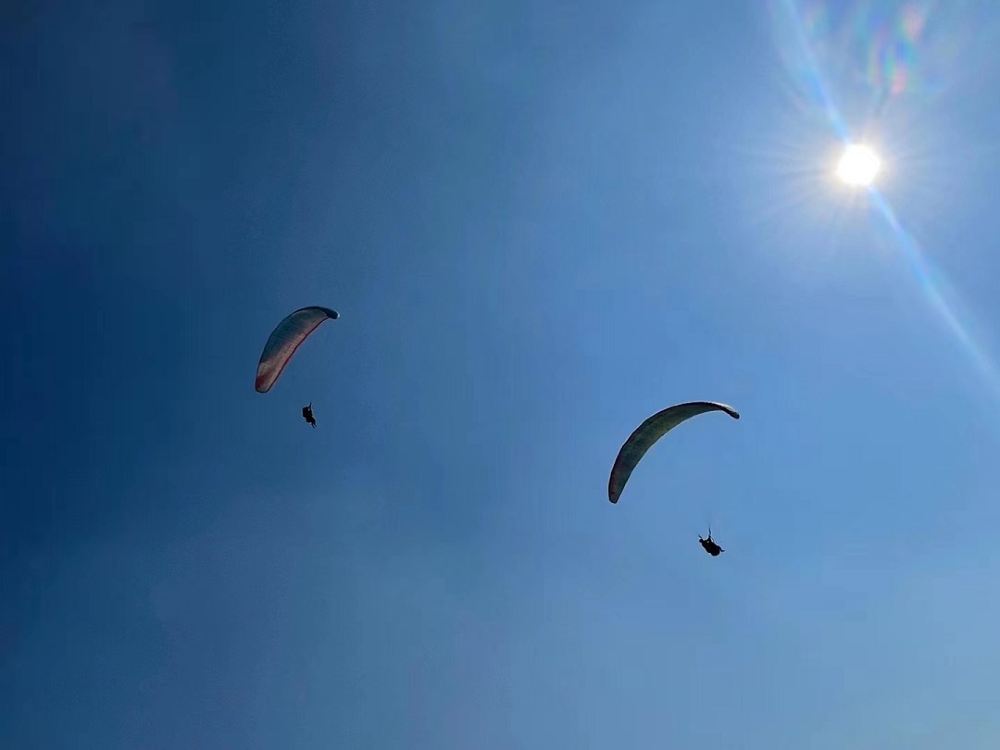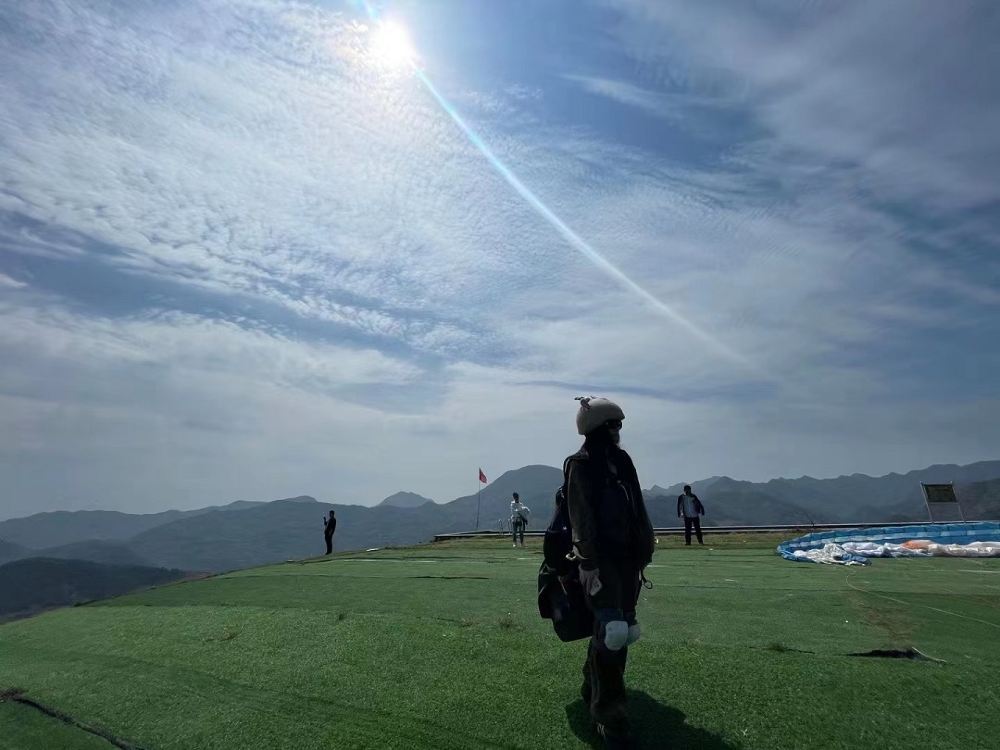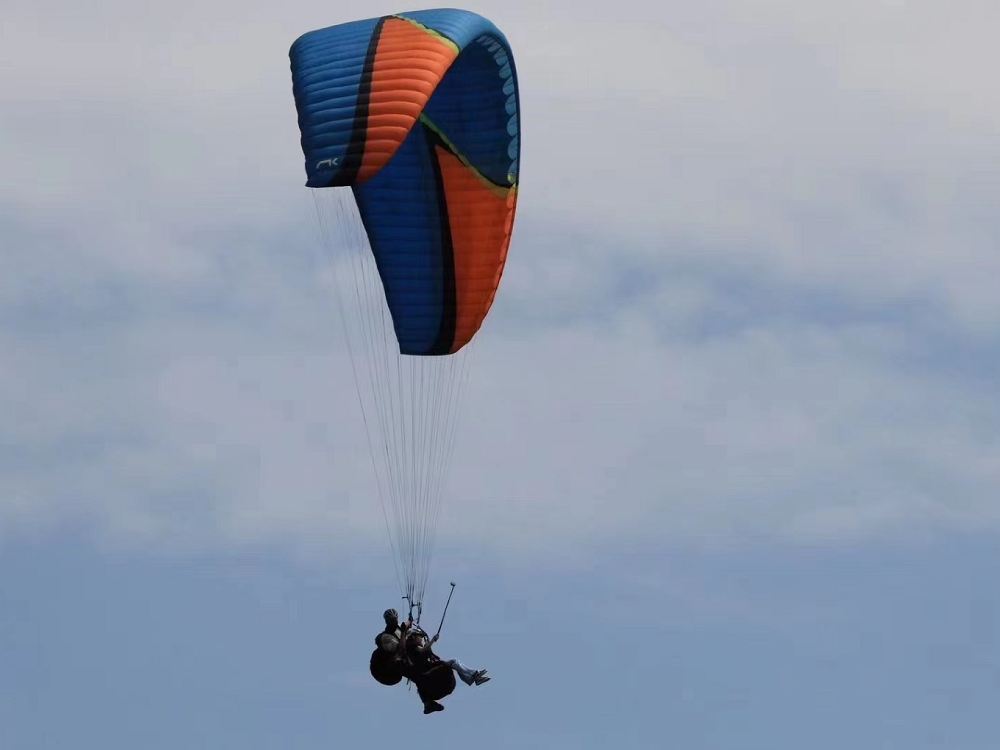 7、滑翔傘起傘(起飛)時,請您務必全力配合教練,身體微微前傾,協同用力,控制身體重心用力向教練指示方向奔跑,直至飛出山體為止;