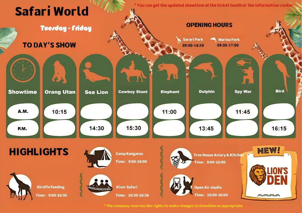【 週二至週五表演時刻表 】僅供參考,具體時間以動物園當天公告為準