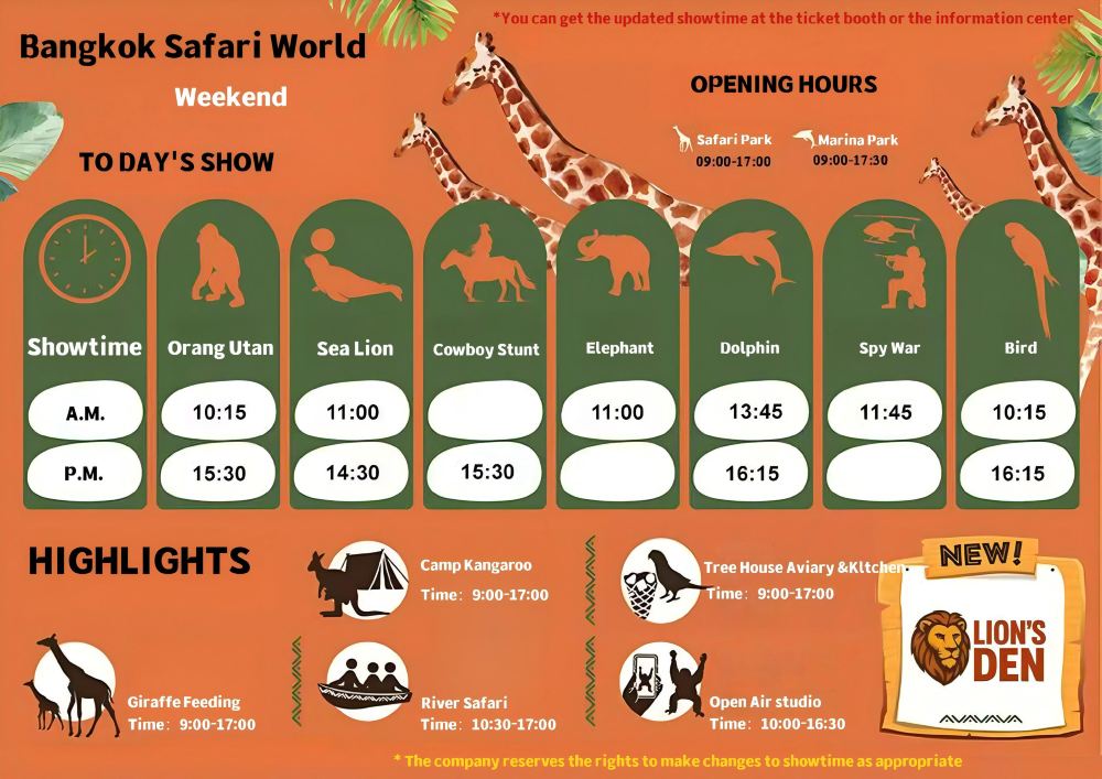 ● 在海洋公園入口處,有每天的表演時刻表,可以拍照留存,請提前抵達表演場地;海洋公園內每天安排很多有趣表演(人猿表演、大象表演、海豚表演、鳥類表演等等.....此外還有泰國民間舞、巴布亞新幾內亞土風舞、美國西部牛仔武打等表演,請按照公示牌去觀看)
