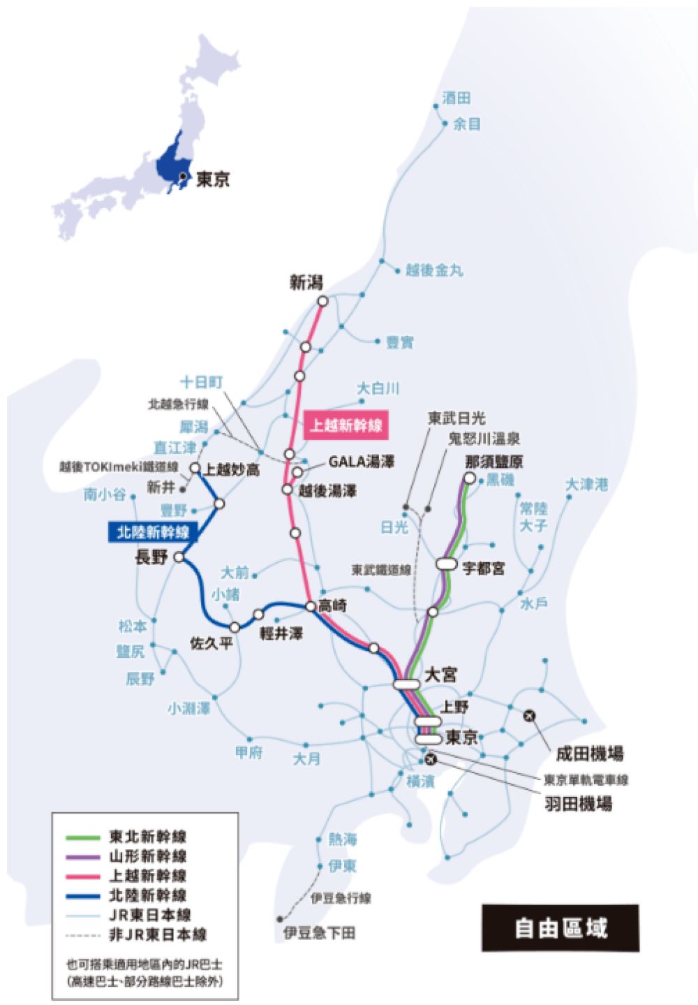 - JR東日本鐵路周遊券(長野、新潟地區)無法搭乘東海道新幹線。(因東海道新幹線由其他公司營運)