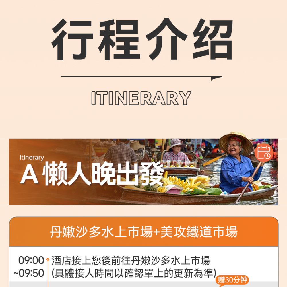 指定地點上車09:00 曼谷 指定地點上車 *約09:00~09:50來酒店接您(每日路況不同,大家酒店位置接送順序也不同,具體以確認單上時間為準,請您知悉並配合)。 *請您準時在酒店大堂等候(不要在房間裡),切勿遲到,司機最多等待10分鐘,逾期未出現將會視作自動放棄,請您知悉;