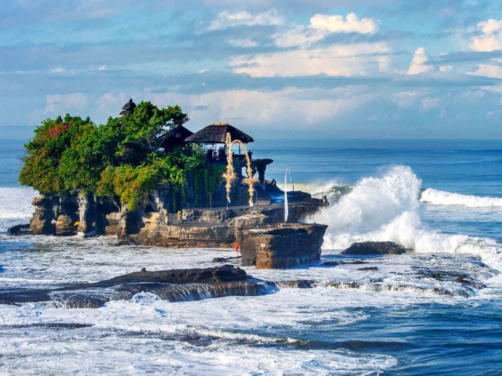 ▲海神廟(Tanah Lot Temple):峇里島著名的海上廟宇,建於16世紀,坐落於離岸的礁石上。漲潮時海水環繞廟宇,退潮時可步行至礁石底部,廟宇與海浪、落日構成的畫面極具標誌性,是峇里島宗教文化的重要象徵。