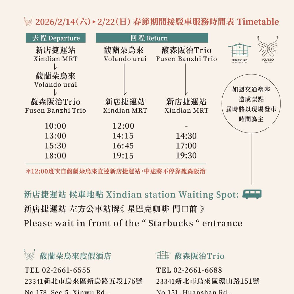 - 馥蘭朵接駁車服務 NT$50 單趟,因座位有限,如欲搭乘接駁車者,請自行聯繫馥蘭朵烏來渡假酒店並提供 供應商訂單號