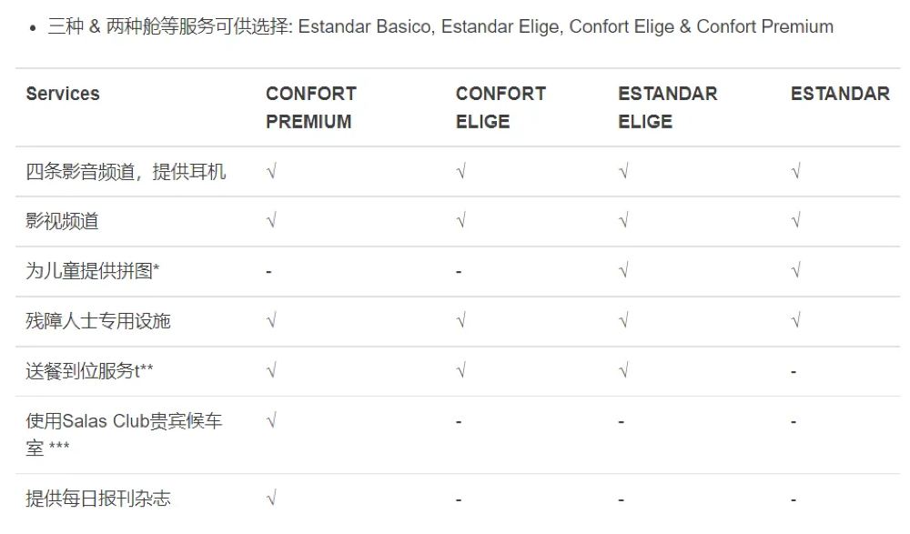 •Confort艙的Elige票價允許申請一頓冷食或一頓熱食(需額外申請和付費,暫時還不能預訂)