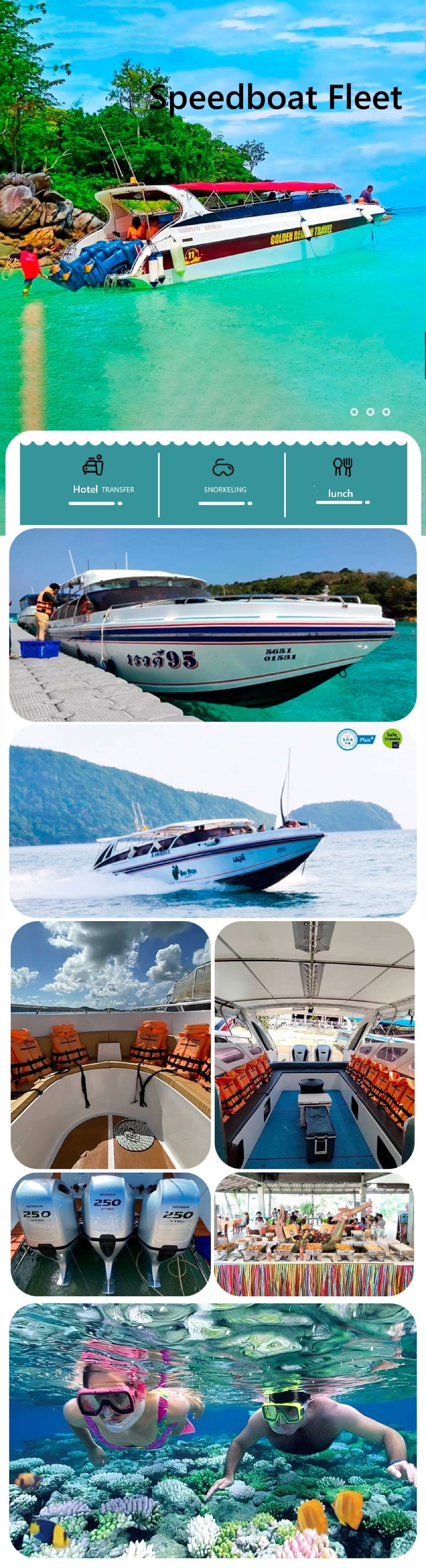 ▲ 快艇艦隊 ●多艘快艇隨機發船 ●7:00-8:45 飯店接您前往查龍碼頭,享用簡單的早茶: 咖啡、飲料、麵包、餅乾等 ●9:00-9:30 乘船前往皇帝島,在島上自由活動游泳、浮潛或漫步沙灘 ●在島上餐廳享用午餐 ● 前往珊瑚島,在沙灘岸邊浮潛拍照 ,或者參加自選活動 (需自費) 降落傘、香蕉船等 ●16:30 回到碼頭,送回飯店