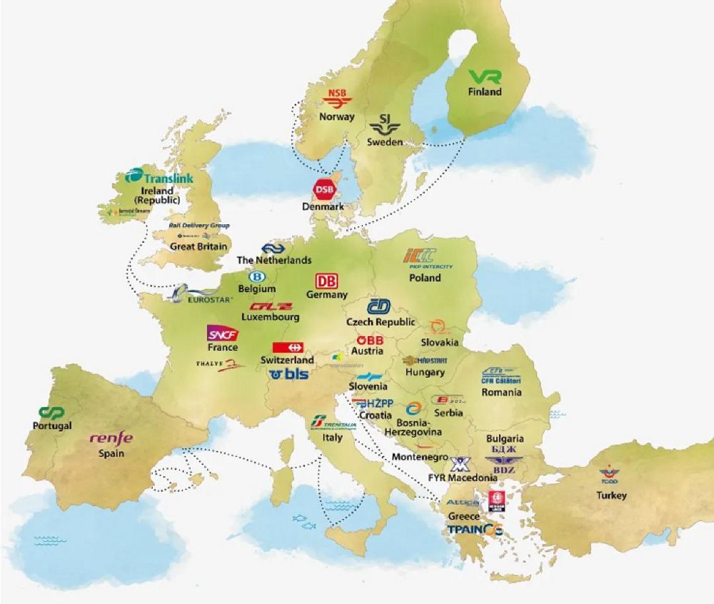 - 歐洲主要火車營運商包含歐洲之星、德國鐵路、Trenitalia、法國國鐵 SNCF 等