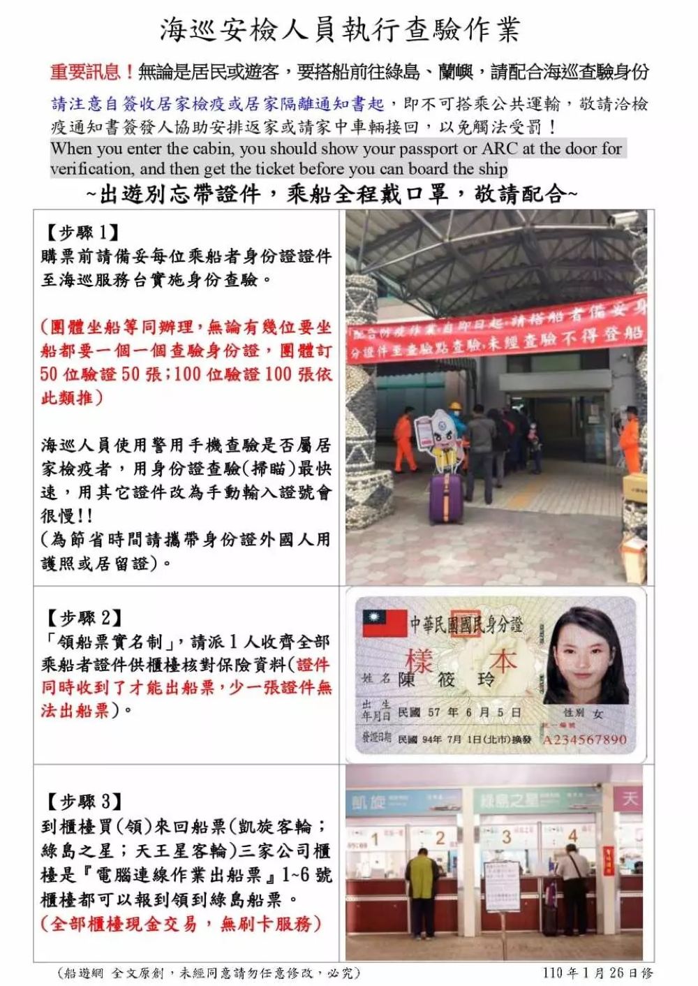 - 凡進入候船室請船主備妥身分證件供海巡人員查驗並於手臂上蓋印章