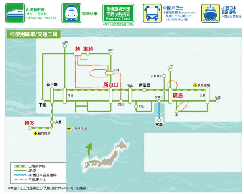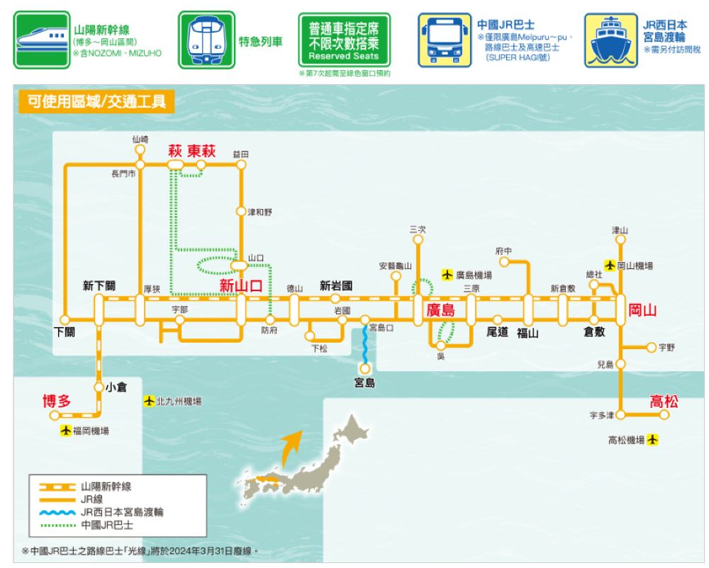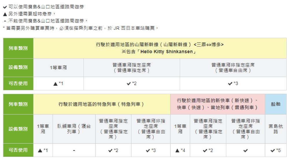 產品詳情請參考官網:西日本旅客鐵道株式會社 - 廣島&山口地區鐵路周遊券 介紹 ( https://www.westjr.co.jp/global/tc/ticket/pass/hiroshima_yamaguchi/ )