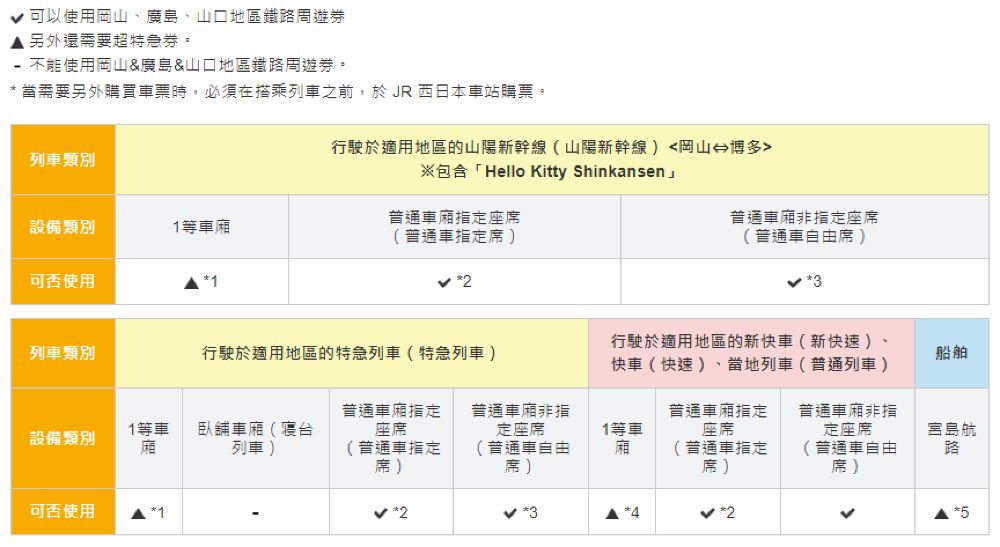 - * 3 部分列車全車皆為指定席,並無設置自由席,全車皆為指定席的列車請參閱此處 https://www.westjr.co.jp/global/tc/ticket/pass/pdf/Reserved_seats_tc.pdf