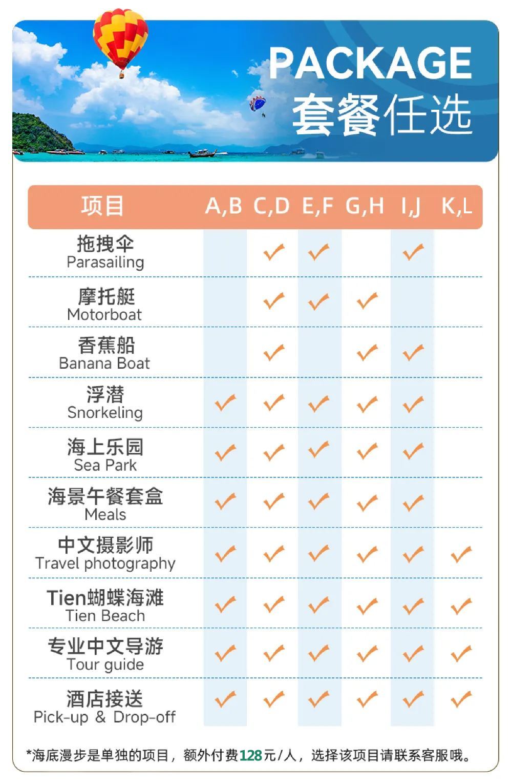J-J : 拖曳傘+香蕉船+基礎組合 | 汽車 (車型待確認) | 英文 | 去程到府接 | 併團導覽 | 25 位旅客 | 一般導遊 | 含午餐 | 送到府 | 格蘭島·體驗項目-香蕉船/拖曳傘/浮潛/滑梯/立式划槳板/水上樂園