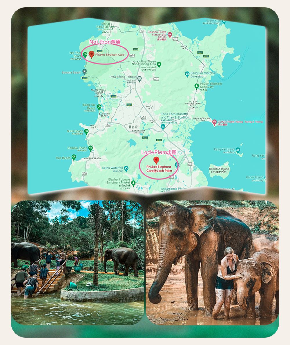 泰萌大象保護營有2個象園分園:Nai thon奈通和Lock Plam卡圖,根據顧客飯店位置/購買組合隨機就近安排