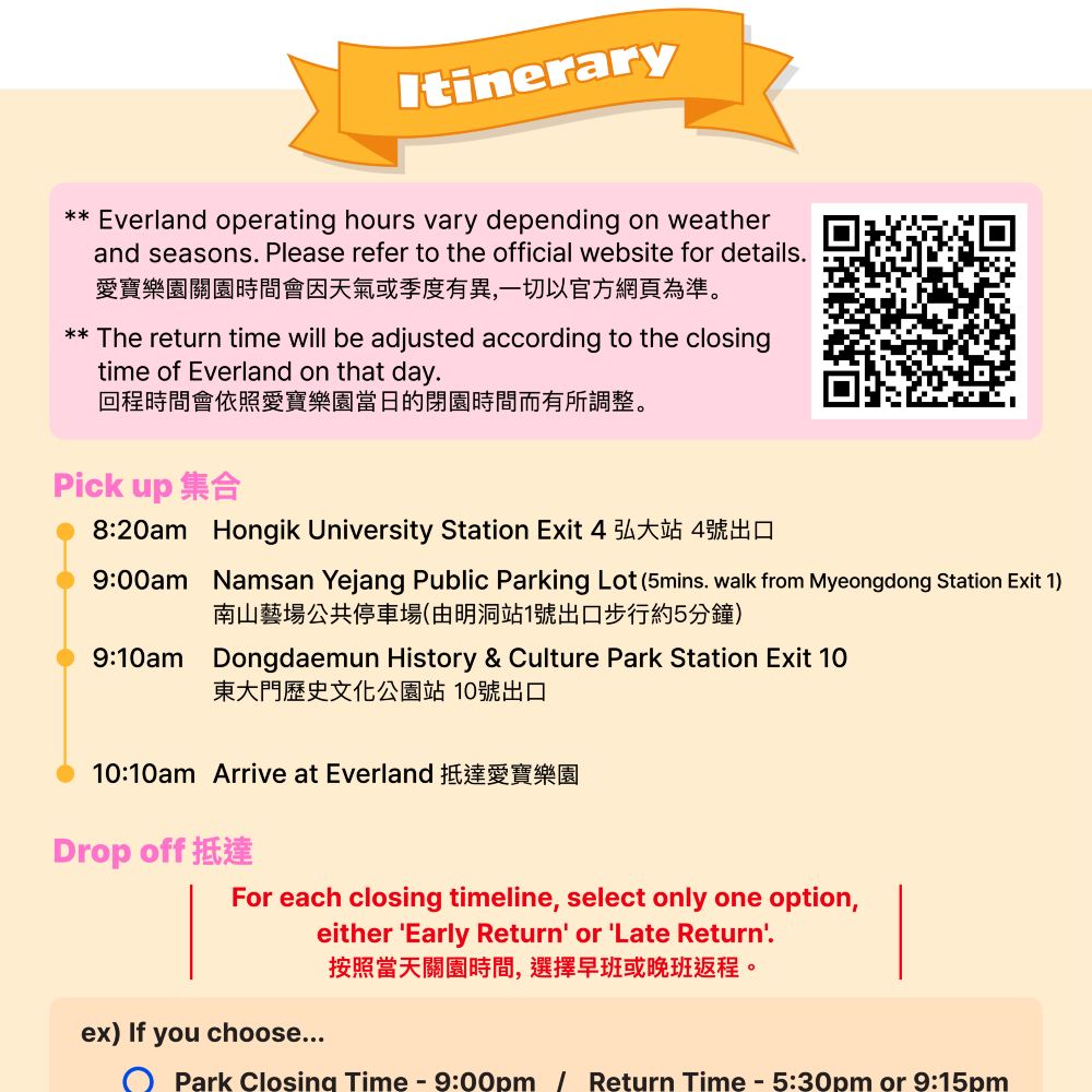 21:15 首爾 東大門歷史文化公園站 解散 回程時間會依照愛寶樂園當日的閉園時間調整 * 愛寶樂園關園時間會因天氣或季度有異,一切以官方網頁為準* 1) 7點閉園時:19:15 返回首爾 2) 8點閉園時:第一班: 16:30 返回首爾 / 第二班: 20:15 返回首爾 3) 9點閉園時:第一班:17:30 返回首爾 / 第二班: 21:15 返回首爾 4) 10點閉園時:第一班:18:00 返回首爾 / 第二班: 22:15 返回首爾