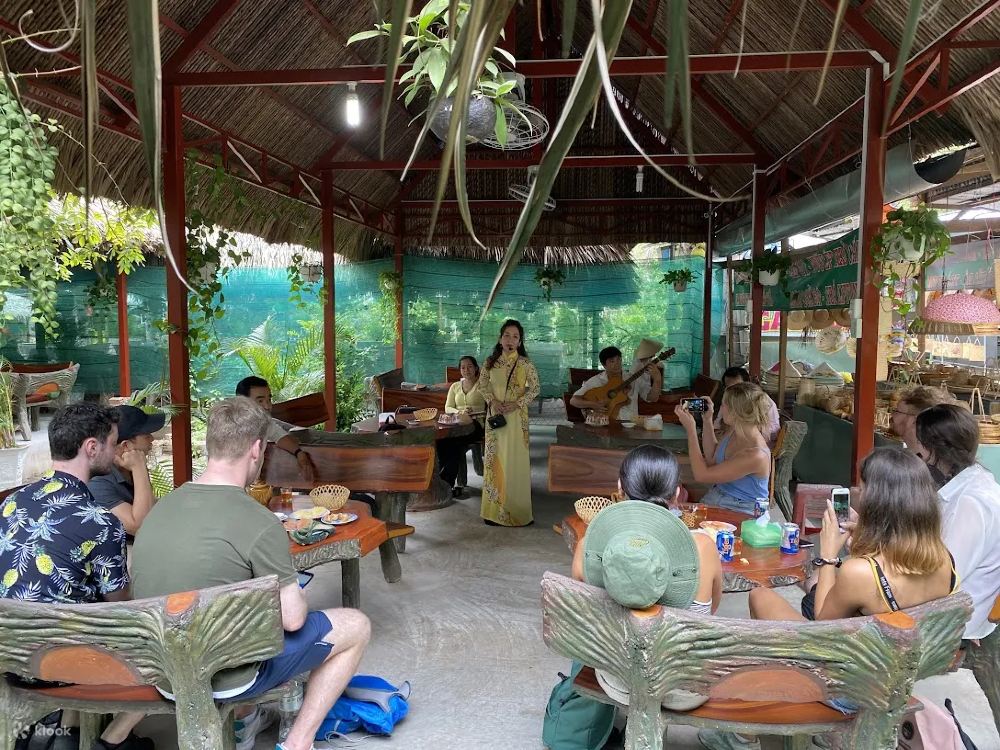 在泰山島上婀娜多姿的越南女子獻唱南方歌謠,歌曲柔美溫婉,參觀蜂蜜養殖基地,免費品嚐蜂蜜茶,應季水果。景點活動