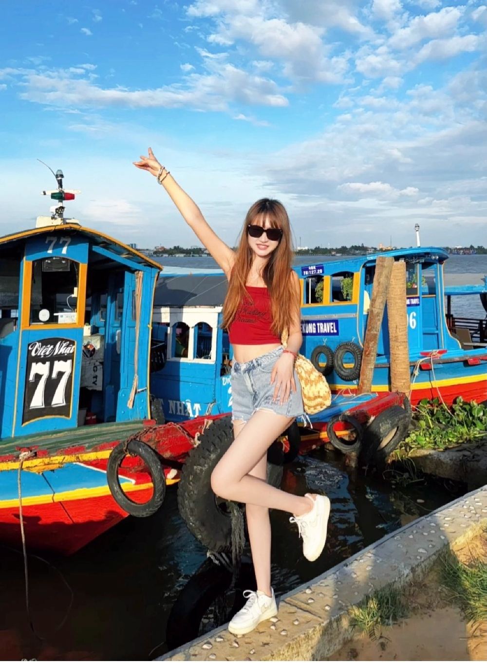 【登上渡河木船】,沿著風景如畫的湄公河航行,還可以看到船家在河中網箱養魚,魚排作息。沿途經過麟島,20分鐘後抵達泰山島。