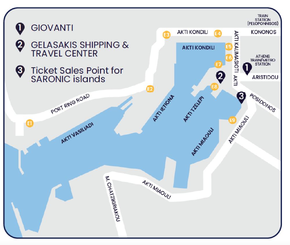 E8 登機門:埃伊納 - 阿吉斯特里和波羅斯 - 赫德拉 - 埃爾米奧尼 - 斯派采斯 - 赫利港