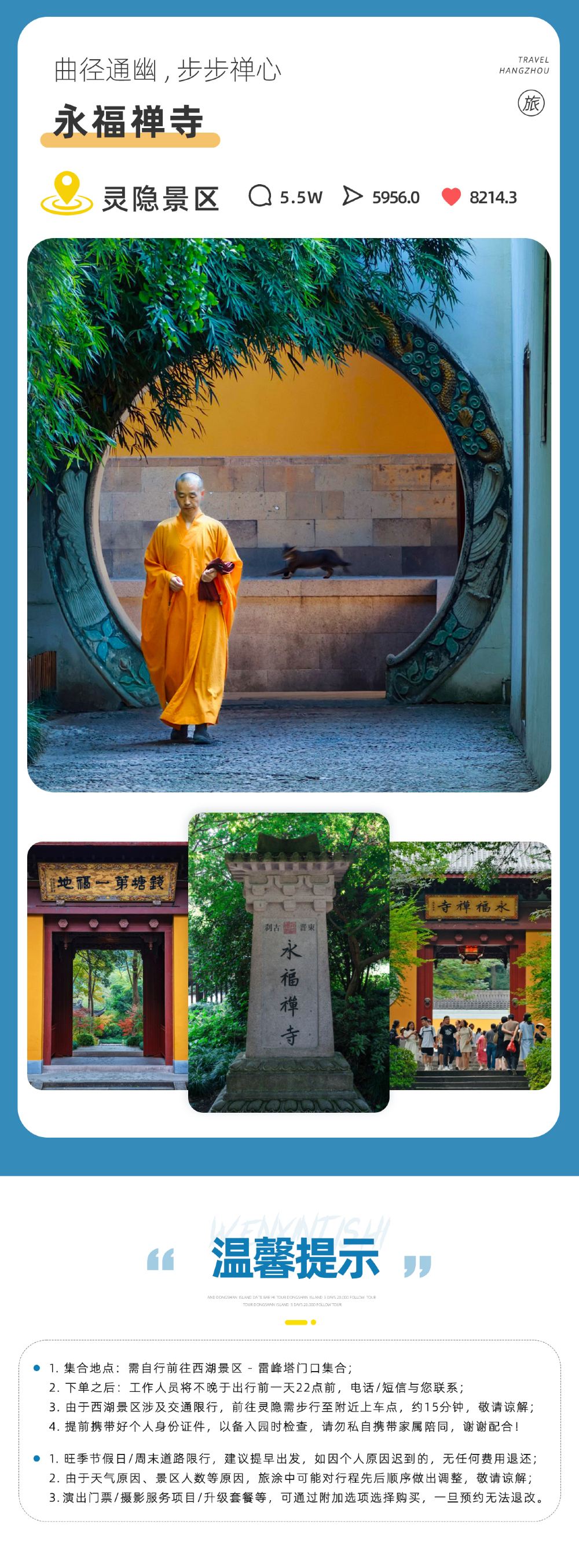 E-時間任選丨6人小團不含素齋抄經 | 國語 | 於集合點集合 | 包團 | 6 位旅客 | 一般導遊 | 不含餐 | 返回指定地點解散 | 靈隱飛來峰景區·景點-永福禪寺/免費行李寄放/免費無線耳麥