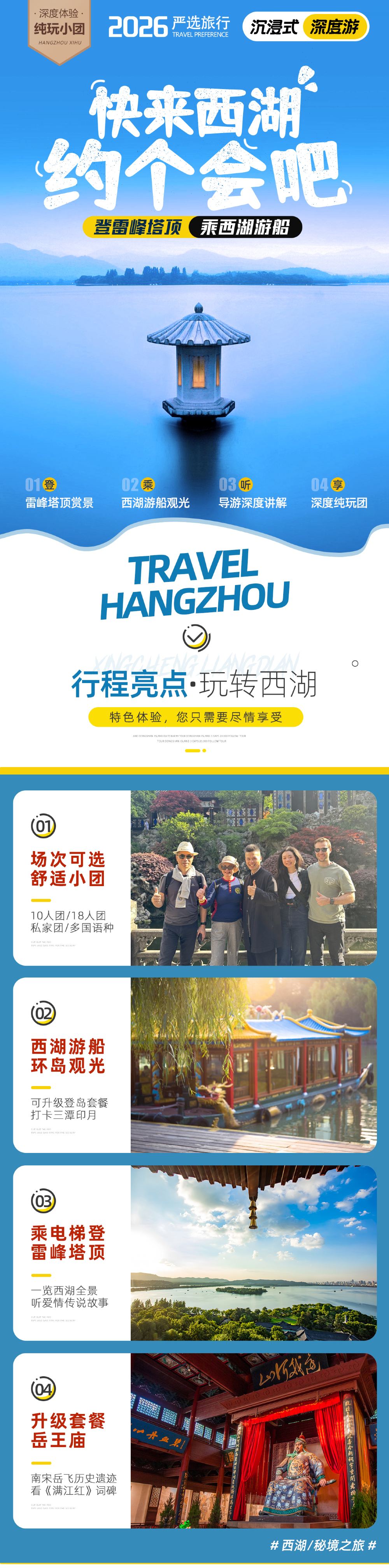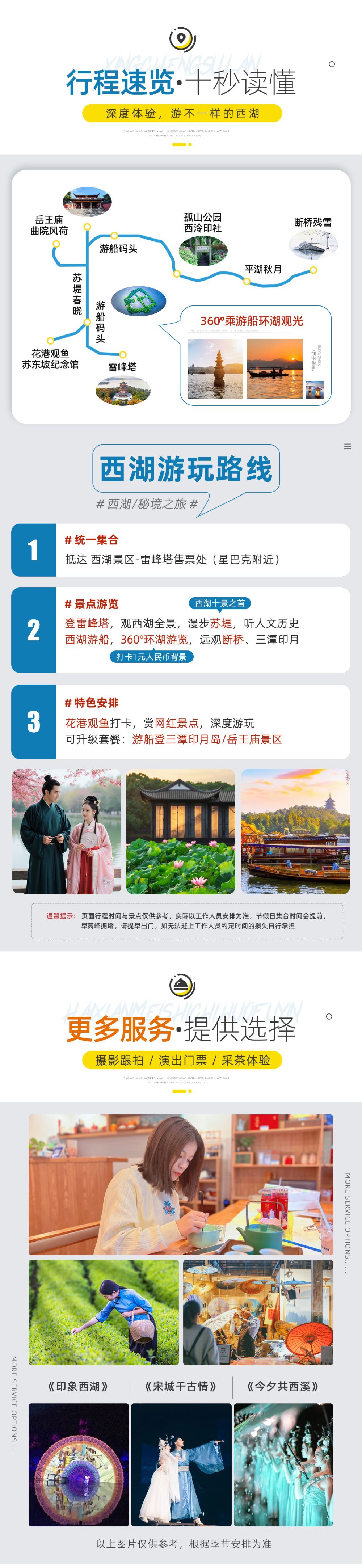 【下午場】遊覽順序:麴院風荷集合 - 西湖遊船 - 登三潭印月島 - 漫步蘇堤南段 - 雷峰塔結束。景點活動