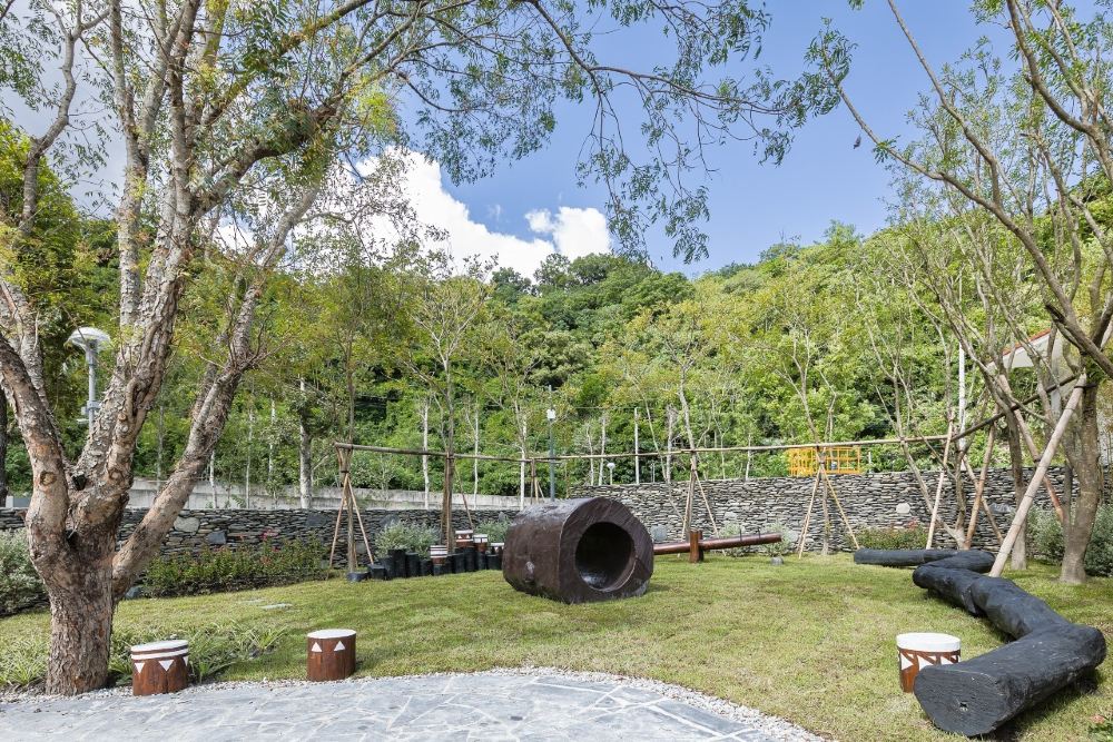 孩子戲水之餘,可以上岸來到鄰近的遊戲區,光著腳丫踏著綠油油的草皮奔跑玩耍,爬入大樹洞裡,坐上蹺蹺板,或是坐著稍作休息,像附近山林中的小猴子般,度過歡樂無憂的童年時光。