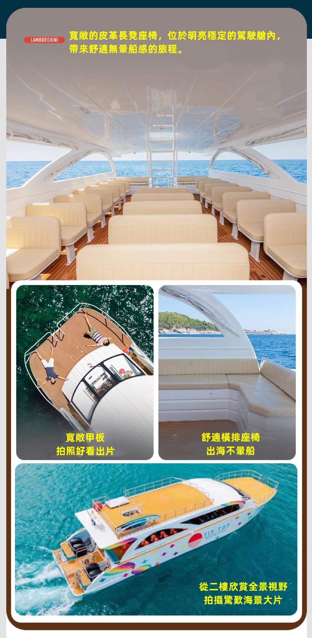 ● 舒適的軟皮座椅、可360度欣賞海景的透明客艙和適合拍照的船首陽光甲板。
