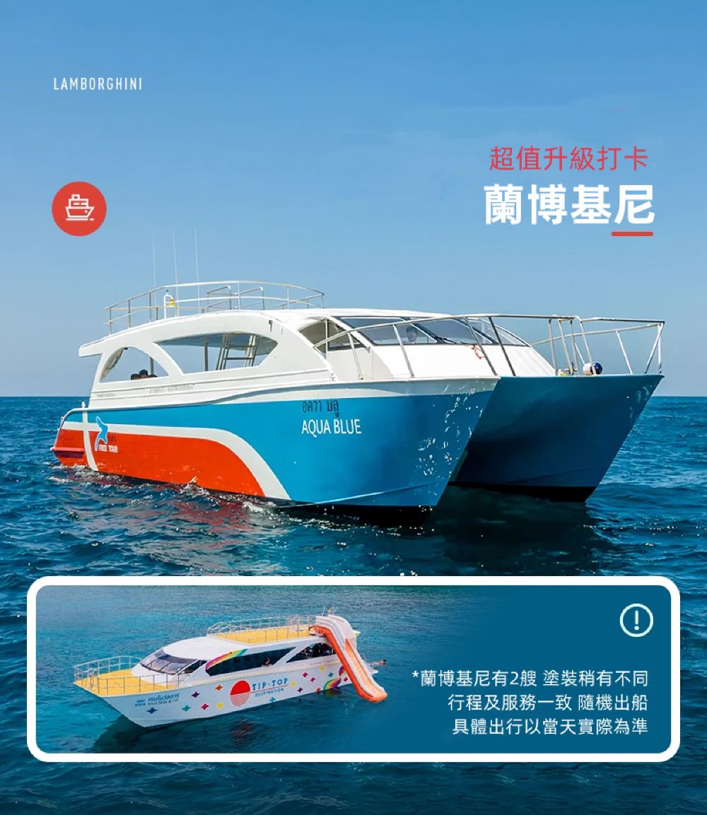 C-蘭博基尼-4島聯遊+水上滑梯 | 汽車 (車型待確認) | 中文 | 去程到府接 | 併團導覽 | 70 位旅客 | 一般導遊 | 含午餐 | 送到府 | 雞蛋島·設施及項目-登島遊覽(上島費) | 皮皮島·船型-雙體遊艇&船號-林寶堅尼號&設施及項目-浮潛/登島遊覽(上島費)