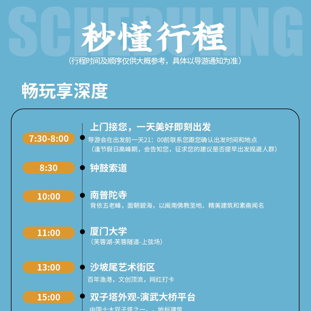 指定地點上車09:00 廈門 思明區,湖里區 指定地點上車 鐘鼓索道景區門票是80元/位,本旅行社為團隊票預約,請知悉,不要產生誤會及誤解。