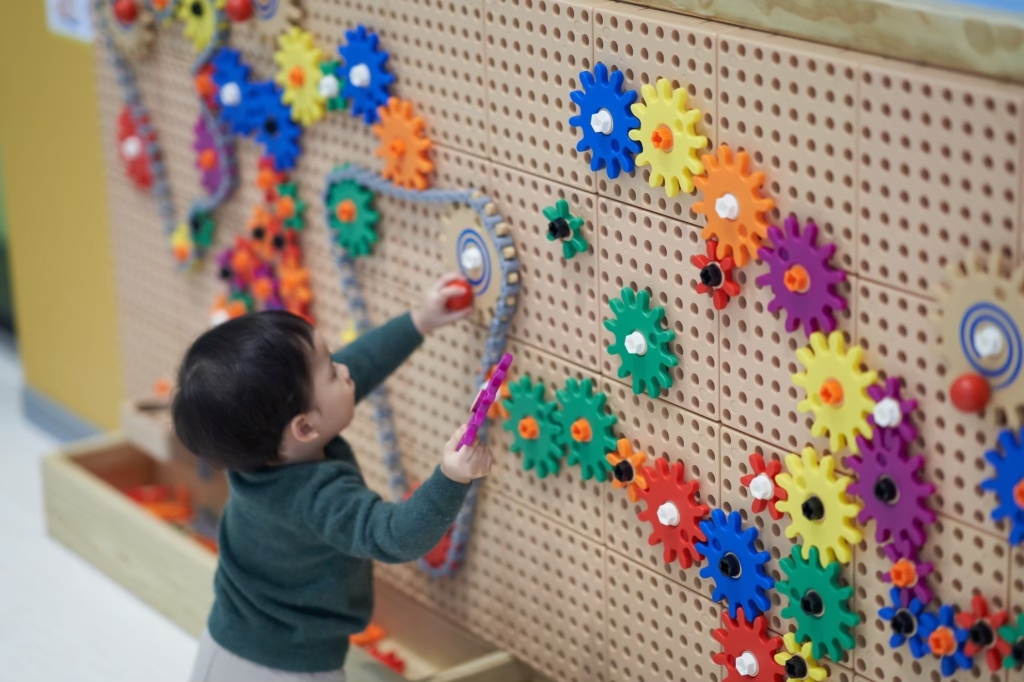 「桃樂比互動遊戲區」透過不同的積木組件,讓孩子們動手訓練出空間感及美感,齒輪的牆面教具更是用簡單的機械原理讓孩子們理解眾多事物的運作法則及佈局規劃!