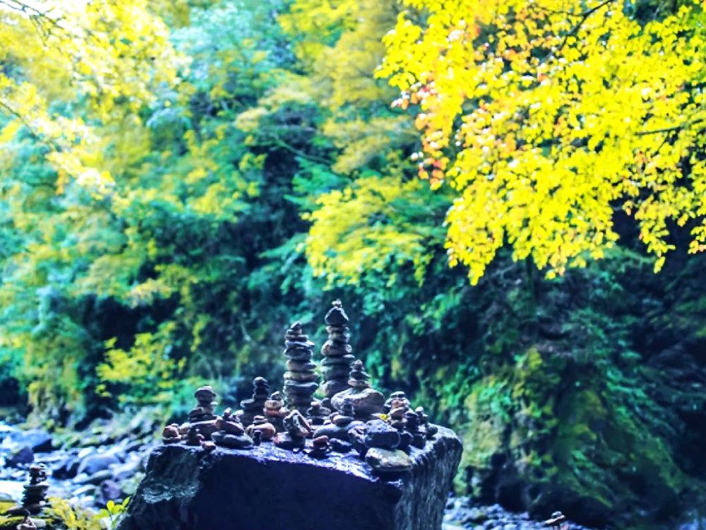 ▲ 天安省原:據說在此堆積石塊許願,即可達成願望,因此前來許願的人們堆起了很多祈願石塔