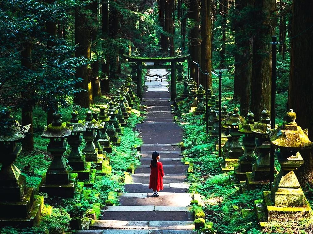 ▲ 上色見熊野座神社位於日本熊本縣阿蘇郡高森町,是一座充滿神秘色彩且歷史悠久的神社,通往神殿的參道上,97座石燈籠排成一排,沿著260多級的石階梯延伸向上。石燈籠和石階都佈滿青苔,陽光照射下,樹影與青苔石燈的影子交織,形成夢幻般的氛圍