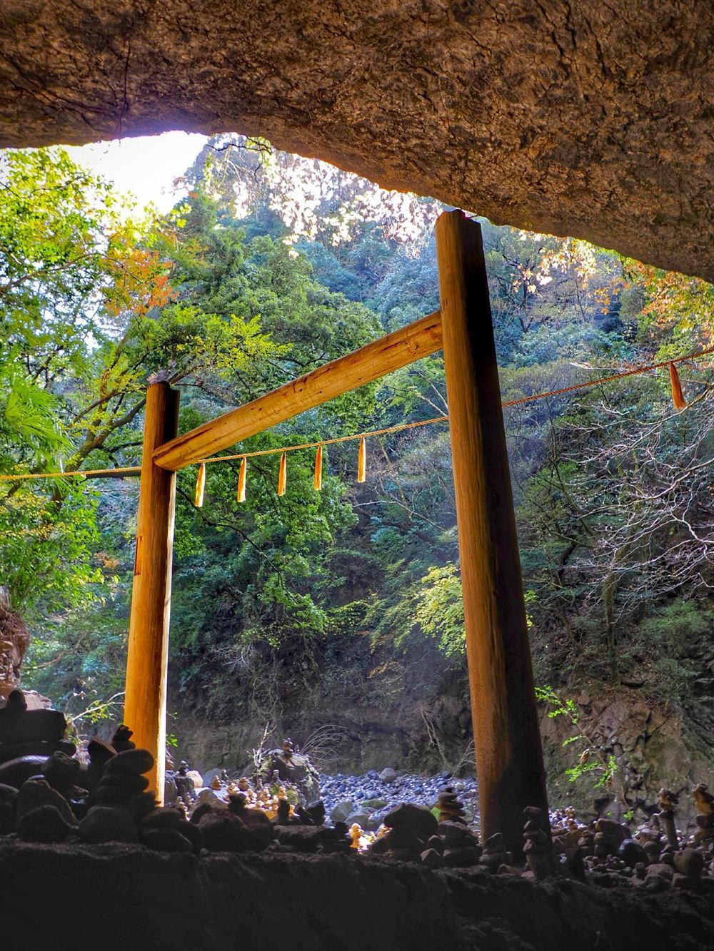 ▲ 天安省原, 一條被綠意包圍的靜謐步道,沿著河流緩緩前行,終點是一座隱藏在岩洞中的神社。 這邊有許多堆疊而成的祈願石塔,營造出寧靜又神秘的氛圍。