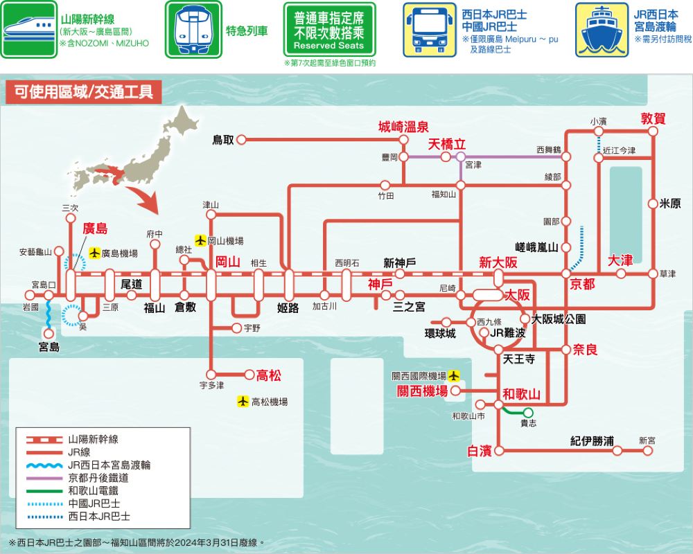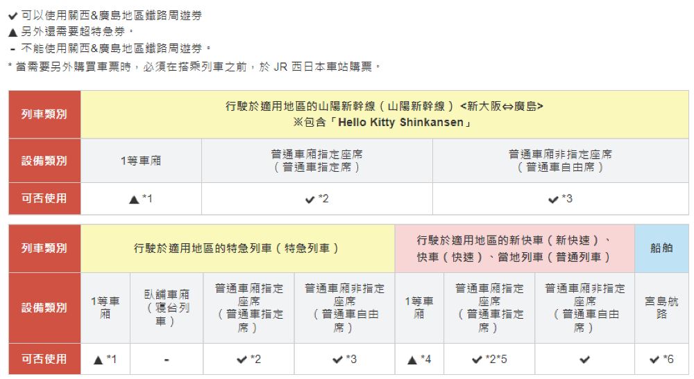 產品詳情請參考官網:西日本旅客鐵道株式會社 - 關西&廣島地區鐵路周遊券 介紹 (https://www.westjr.co.jp/global/tc/ticket/pass/kansai_hiroshima/)