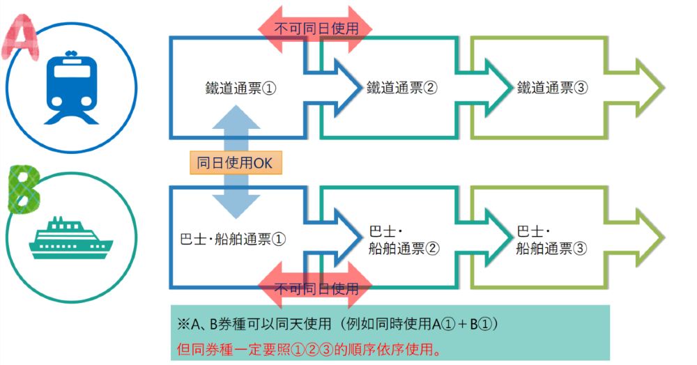 ・可於同一天內使用"巴士・船舶通票"和"鐵路通票"。