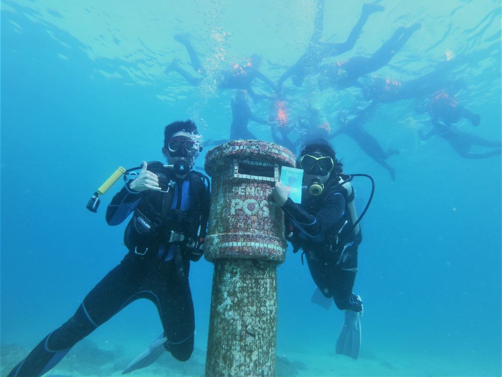 - 可寫上明信片浮潛至海底郵筒由教練潛入海底幫你投出明信片。 (郵筒水深約4公尺左右,依法規著救生衣不可下潛自投,如要自投可建議參加潛水)