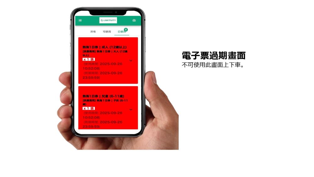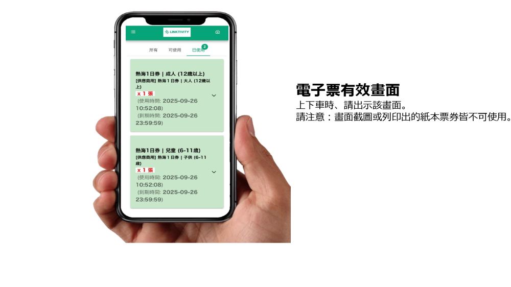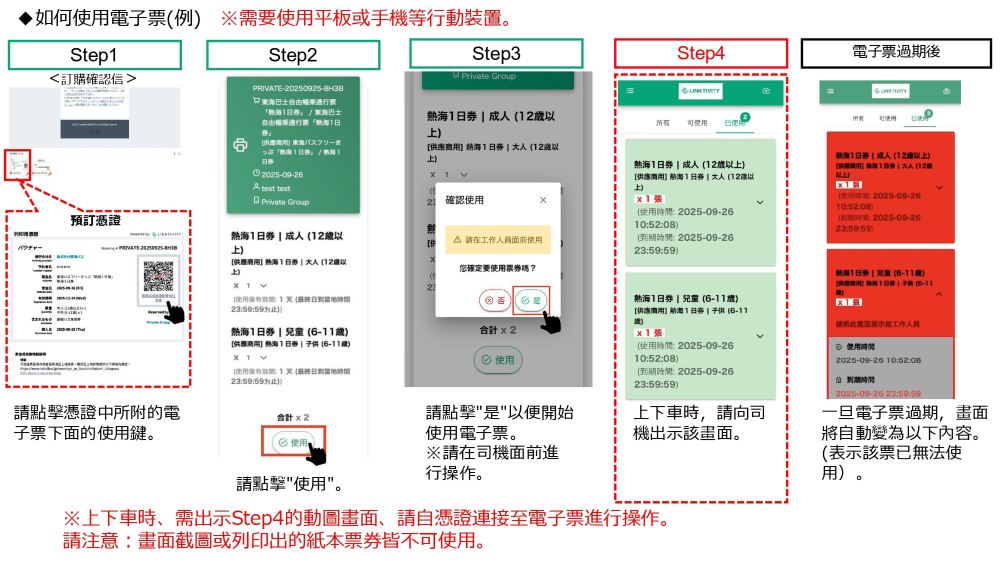 - 上車時,請點擊電子票券中的連結,並點擊「使用」,然後將畫面呈現給乘務員(司機)。