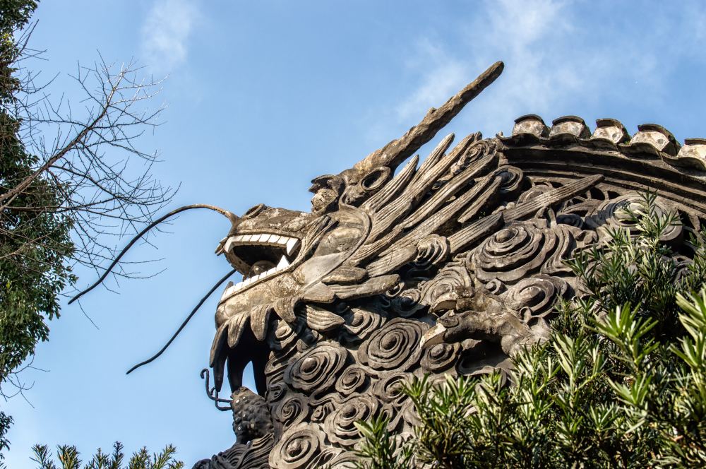 ▲ 穿雲龍牆:點春堂西側26公尺巨龍,泥塑龍頭威嚴昂首,瓦片疊砌龍鱗5000餘片,龍身呈騰躍穿雲之勢,晴日可見「龍銜金烏」(落日嵌入龍口)奇觀。