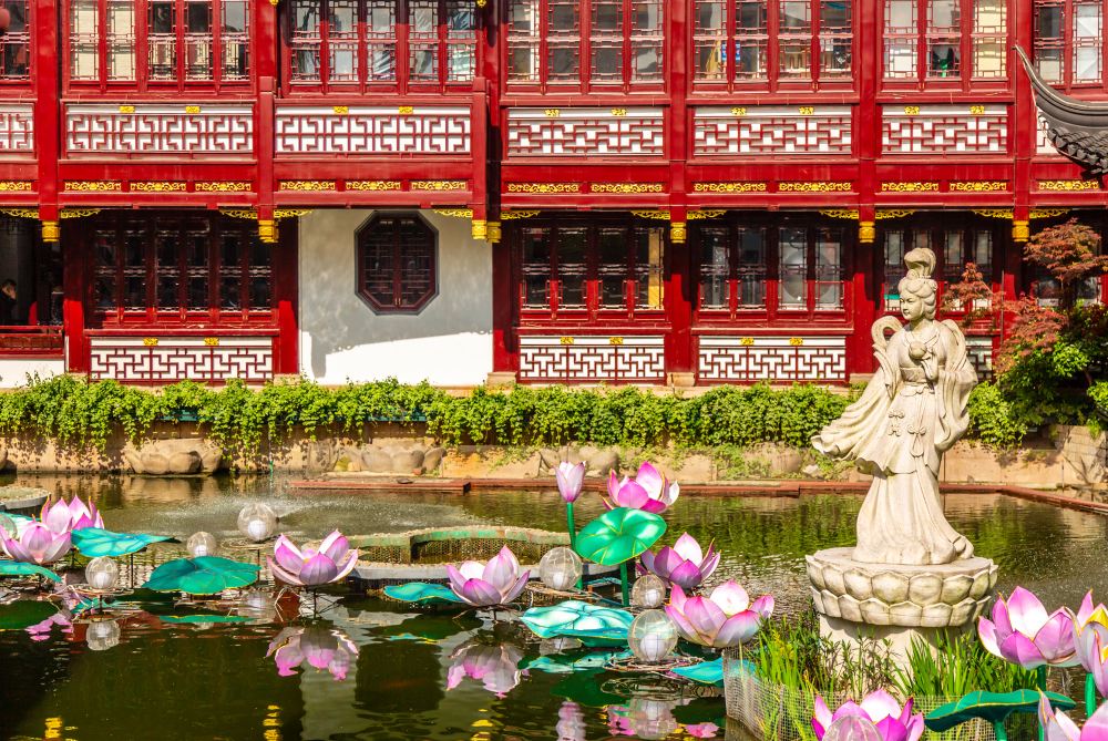 ▲ 這裡可以找到典型的中國道家元素——十二花神代表;哦,不是下面圖中的雕塑神女哦!好奇的你,可以到下面的九曲橋上走一走,低低頭,就能看到中國的12月不同的花神代表啦!