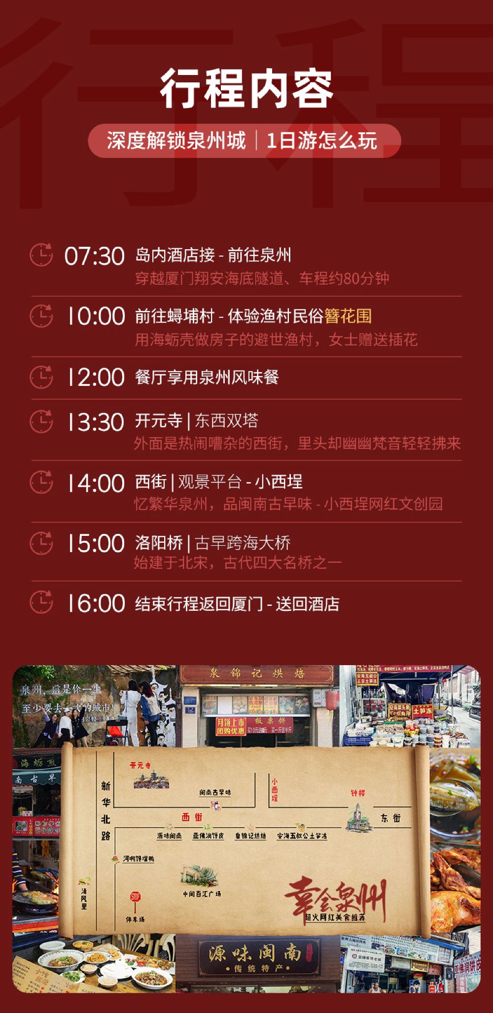 16:30 送回廈門 思明區,湖里區 不提供指定區域外的接/送服務 返回接車點附近。本產品由廈門九洲駿豪國際旅行社有限公司代理招徕,與廈門驢友邦旅行社有限公司、廈門唯途國際旅行社有限公司聯合發團,具體的旅遊服務和操作由委託社提供