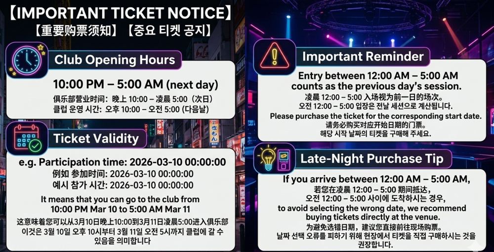 如您於凌晨時段(00:00–05:00)抵達夜店,為避免選錯日期,建議直接於現場購票入場。