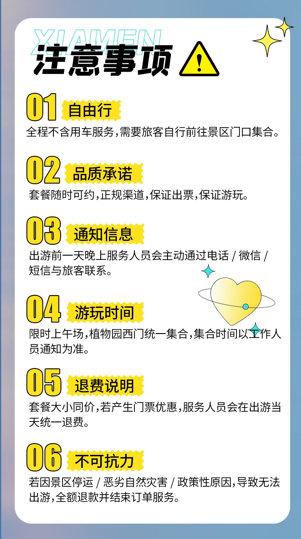 【套餐C行程安排】自行前往集合+鐘鼓索道(導遊帶領進入)+自由活動+南普陀寺約定時間導遊講解(超時未到,可自行入寺參觀)+自由解散 需要【廈大進校】請選擇【套餐B】,行程不含用車服務。景點請自行前往,有任何疑問可隨時諮詢線上客服或當天帶團導遊,感謝理解,謝謝~早餐