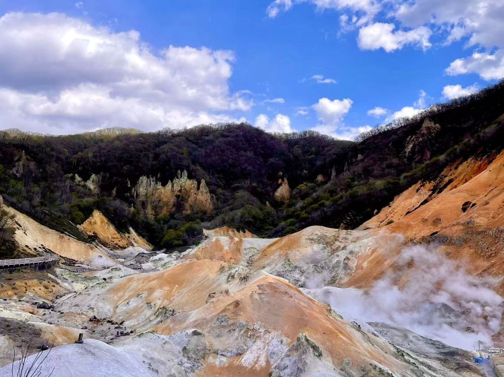 ▲ 登別地獄谷-地熱蒸汽不斷冒出,氣味帶點硫磺味,景觀震撼、真實。走在步道上,能親身感受地球內部的能量。