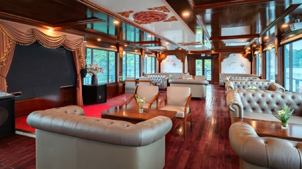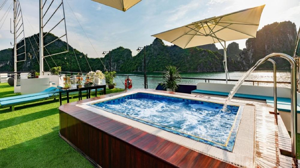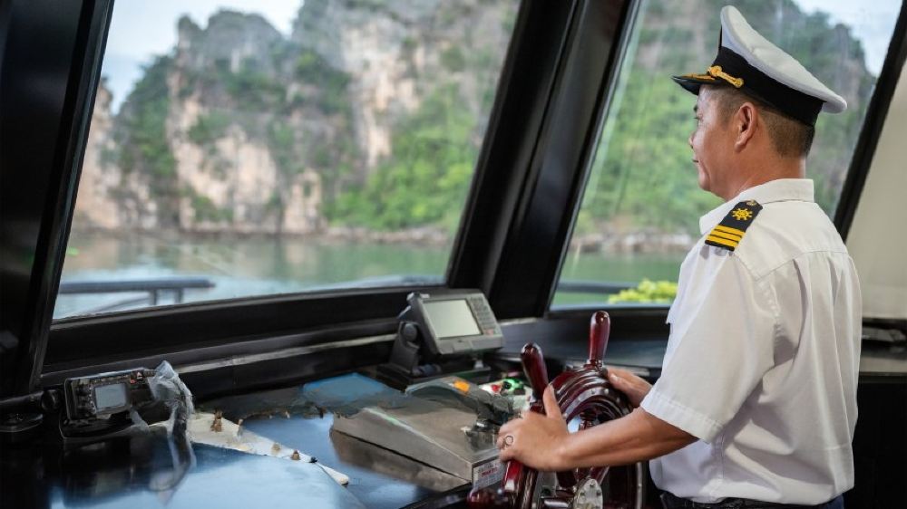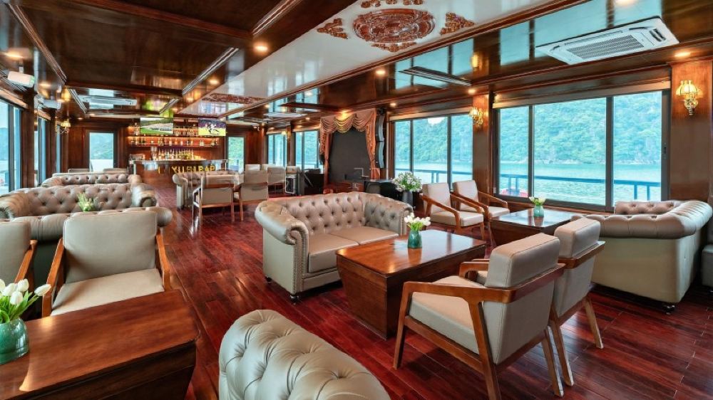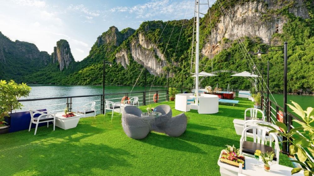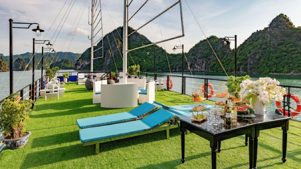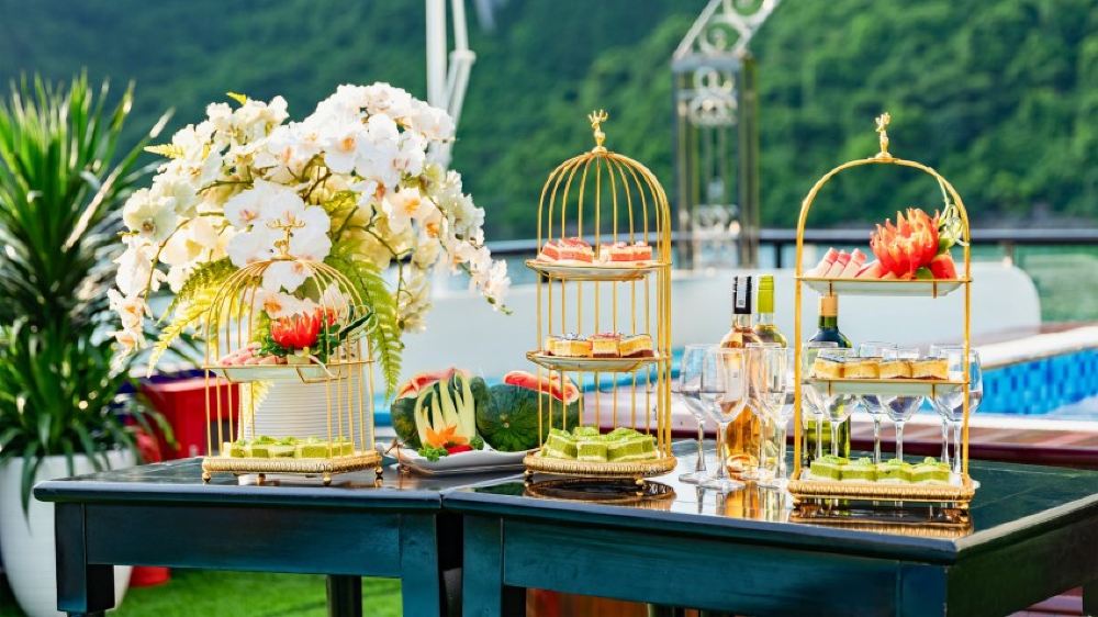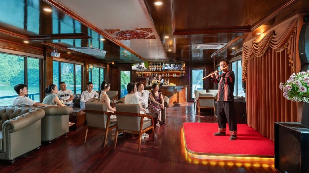 12:30:在船上享用新鲜的海鲜午餐,在甲板上欣赏宁静的美景和令人叹为观止的景色。欣赏那些拥有岩石拱门、陡峭悬崖、白色沙滩、宁静海湾和奇特名字的石灰岩小岛,例如香炉岛和斗鸡岛(下龙湾的象征)。