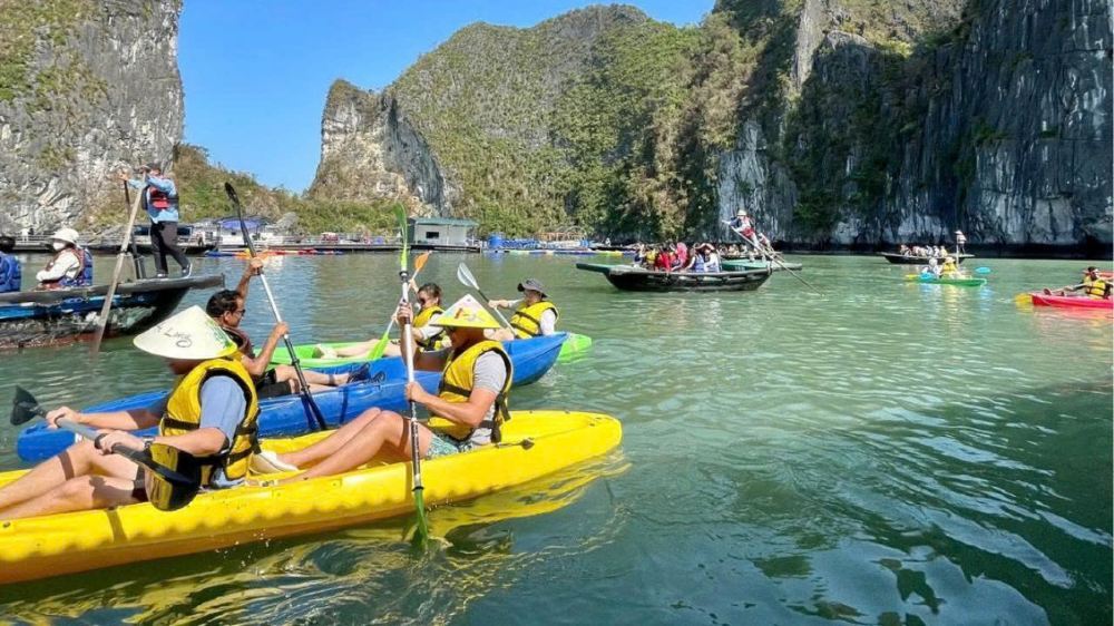 ▲ 在碧綠海水中平靜划著獨木舟的場景,四周環繞著高聳的懸崖——這是探索下龍灣最身臨其境的方式之一。