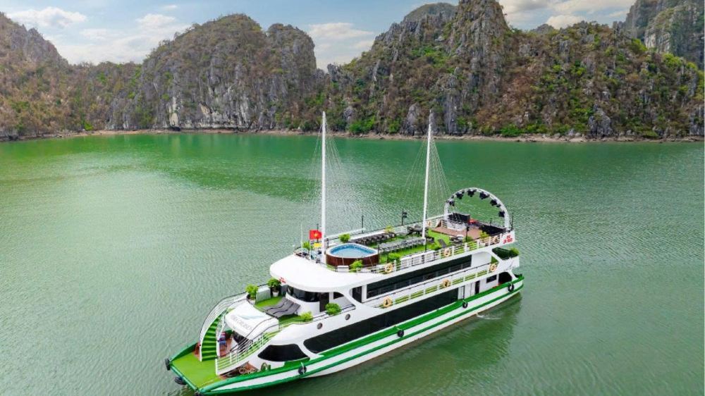 ▲ 一艘現代化的白綠相間遊輪優雅地滑過下龍灣的翠綠水域,四周環繞著雄偉的石灰岩喀斯特地形。