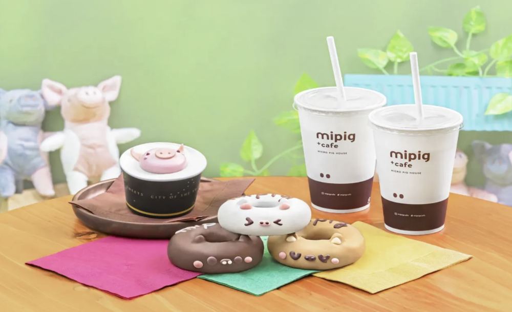 - 與一些可愛的小生物一起玩耍時,享用一杯飲料和小豬設計的特殊甜甜圈