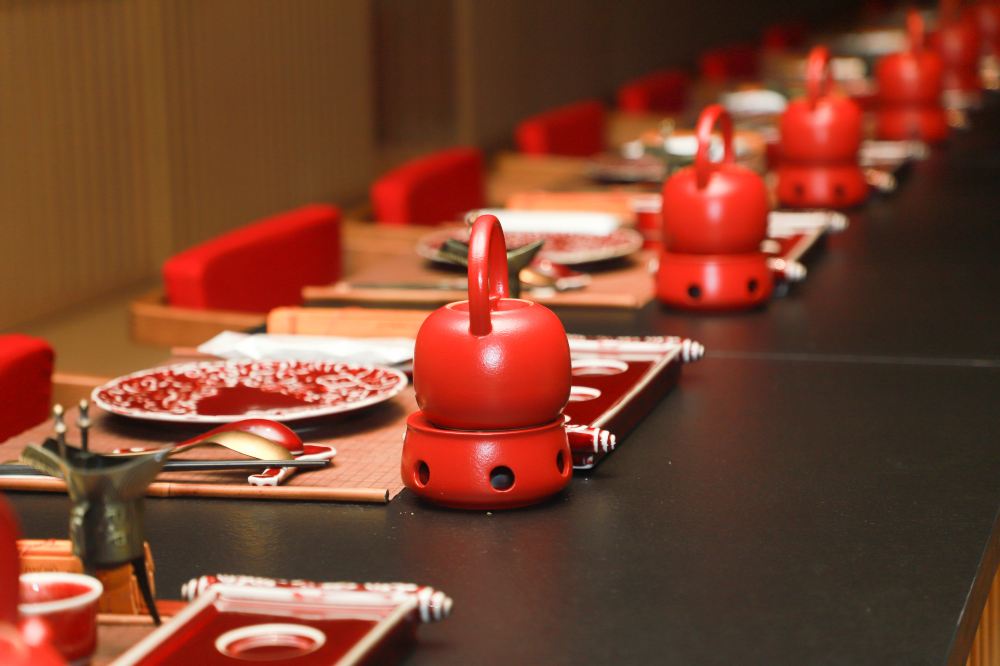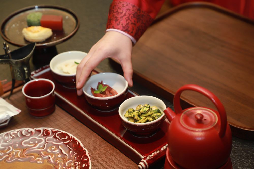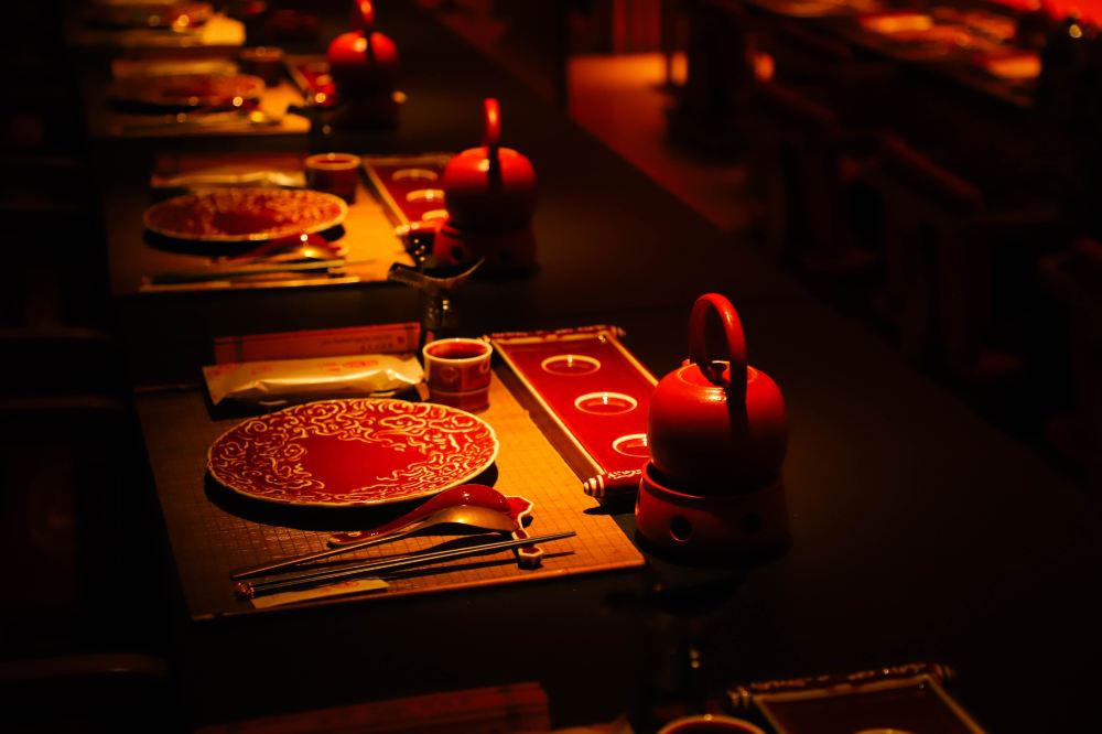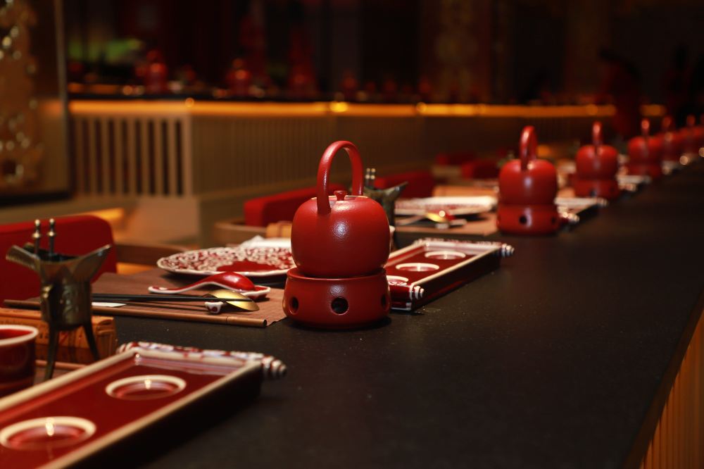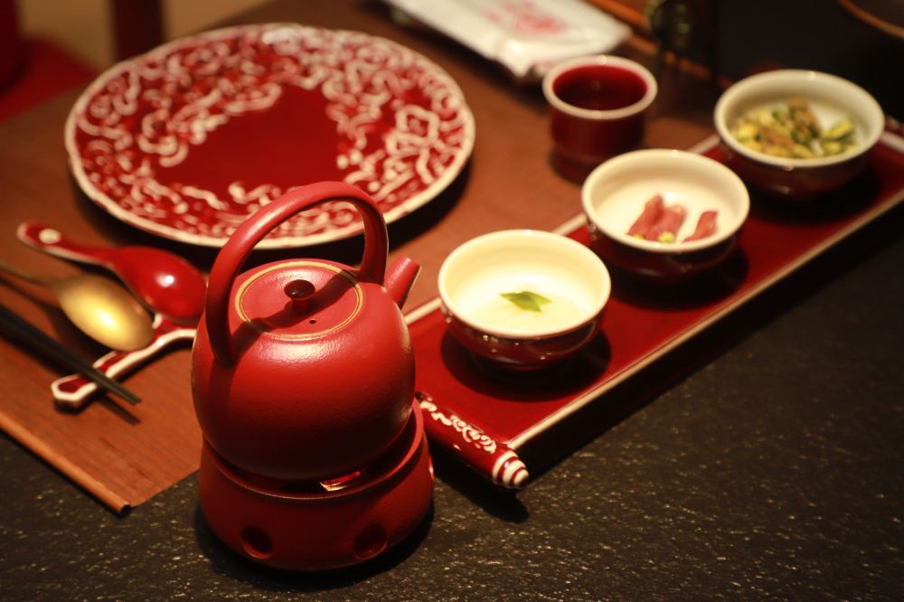 餐廳內,朱紅的茶具與餐具精美雅緻,擺放在桌上,透著古典韻味。