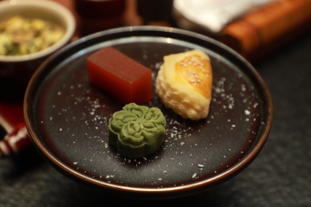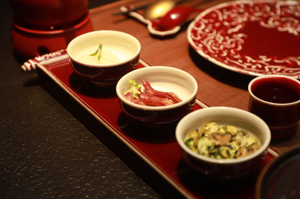 餐食精緻講究,前調冷碟盛於琉璃盞中,擺盤如江南水墨畫;